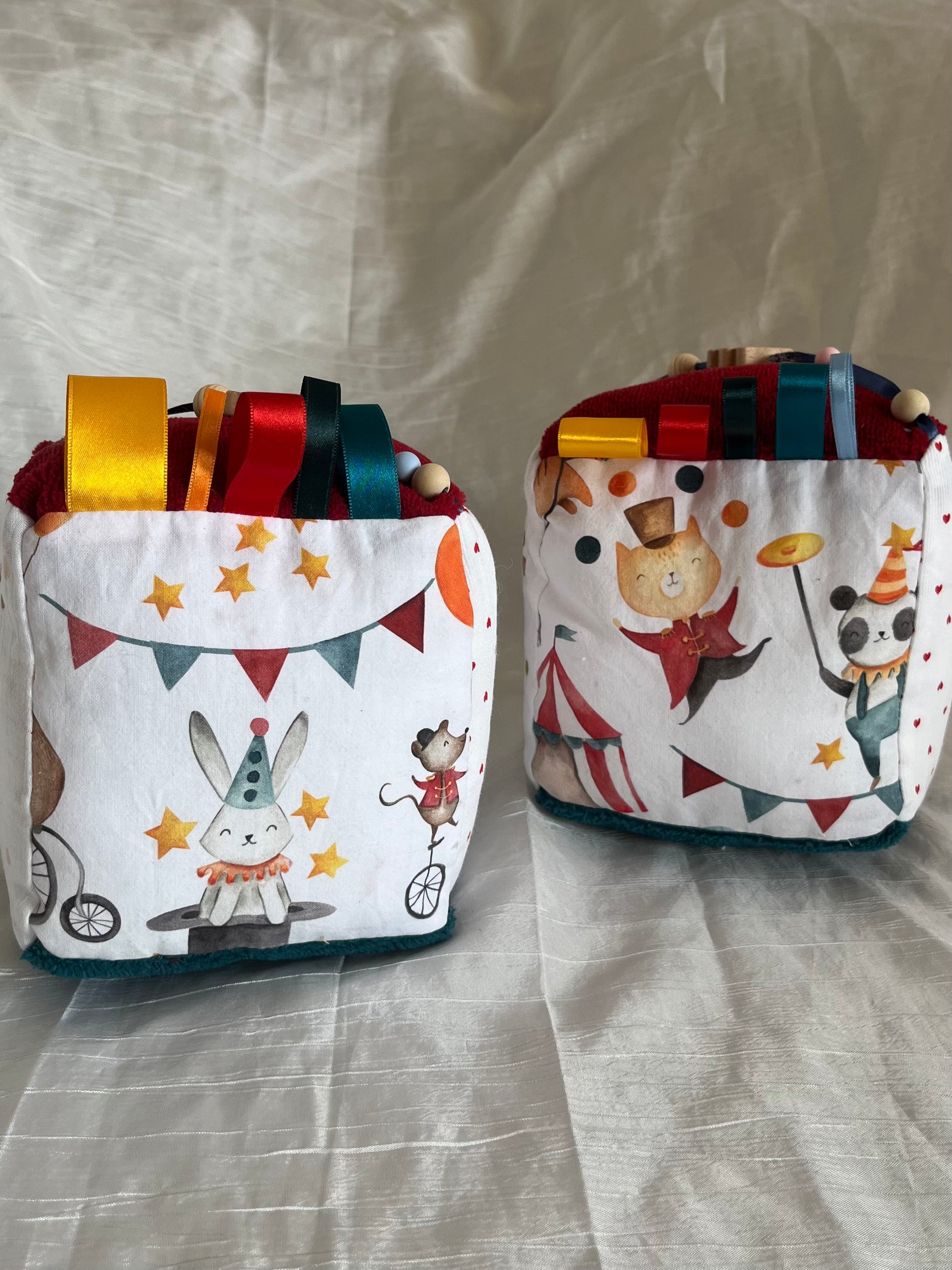 👶 Le Cube d'Activités d'Eveil Sensoriel réuni des textures différentes comme le coton, le bambou, le nid d'abeille, les ruban, le minky ...